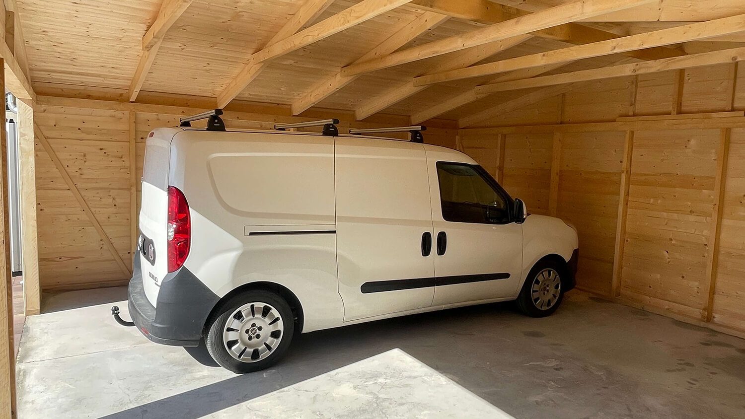 Dupla, 2 autós fagarázs: 3,4m x 6m nyitott résszel, ami teraszként is használható + 3,4m x 6m zárt fagarázs résszel